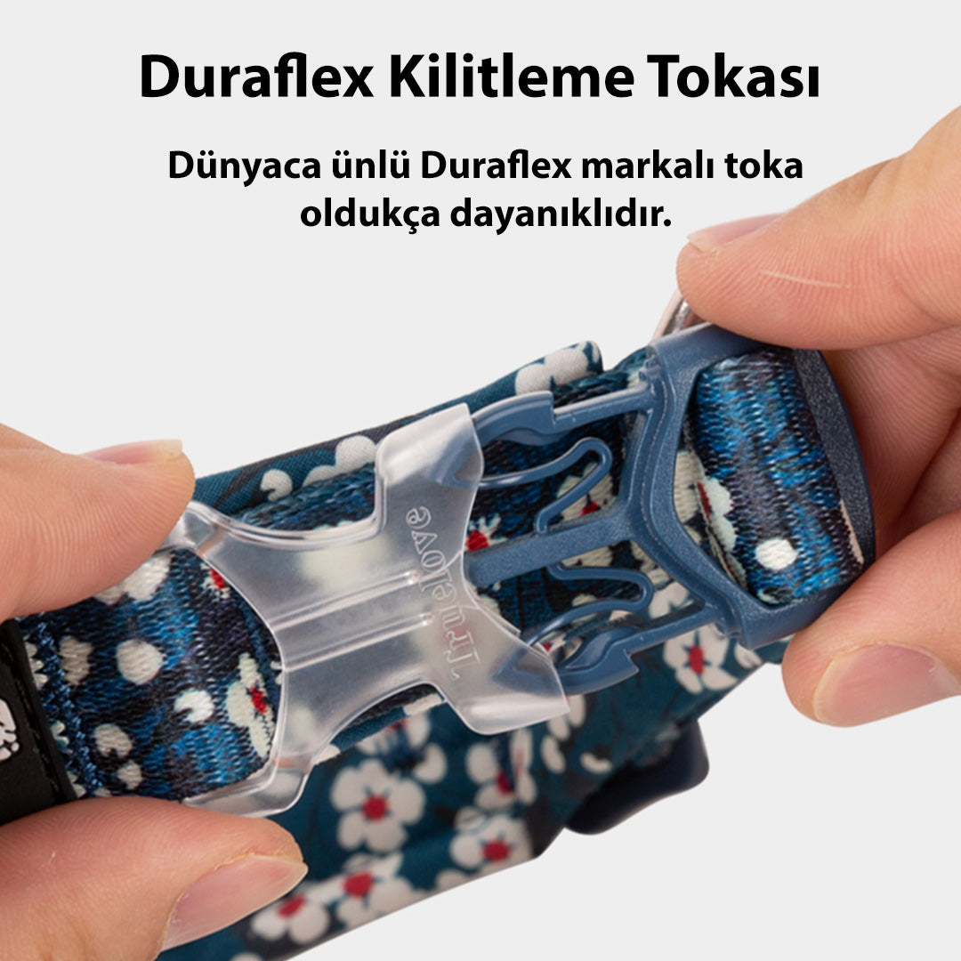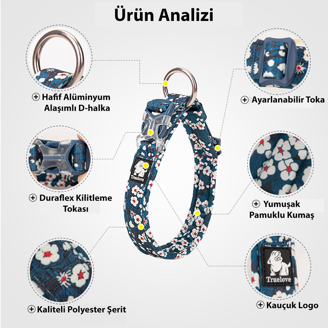 True Love, çiçekli köpek boyun tasmalarının iç yüzeyini yüksek kaliteli pamuk kullanarak tasarlamıştır. Bu sayede tahriş büyük orandan engellendiğinden köpekler oldukça rahat eder. Alüminyum O-halkası ve Duraflex tokalar, tasmanın dayanıklılığını arttırır. Aynı desenlerde bulunan göğüs tasmaları ve gezdirme tasmaları ile eşleştirip küçük dostlarımızın tarzına tarz katabilirsiniz.